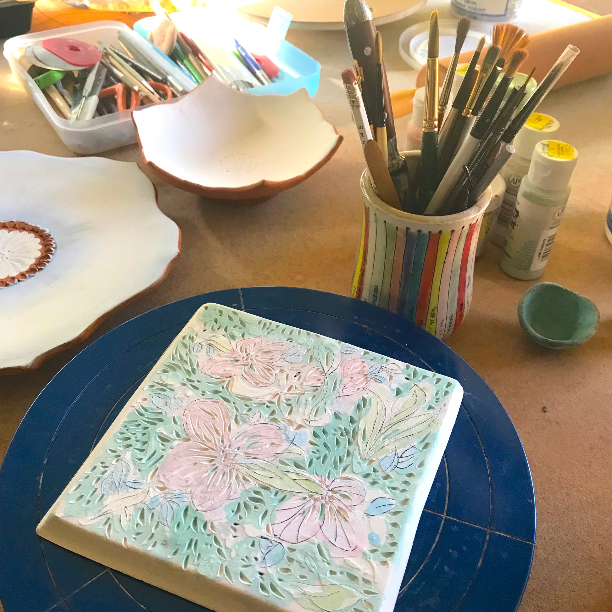 Please note this is primarily a surface design class. Students are welcome to bring their wheel thrown ware for surface work to class. Instruction on simple hand-built forms (small plates, tiles, tumblers) will be covered for beginning students during class.